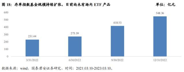 从各类型资产ETF的发展情况看:2022年跨境ETF(QDII)、港股ETF、债券ETF是亮点,截至2023年3月份,相比2021年底的规模提升幅度明显。