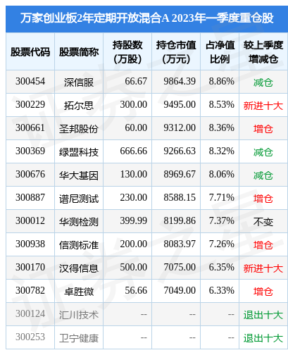 万家创业板2年定期开放混合A的前十大重仓股如下: