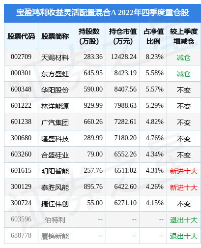 根据2022年报公募基金重仓股数据,重仓该股的公募基金共311家,其中持有数量最多的公募基金为宝盈鸿利收益灵活配置混合A。宝盈鸿利收益灵活配置混合A目前规模为14.47亿元,最新净值1.693(4月20日),较上一交易日下跌2.36%,近一年下跌5.52%。该公募基金现任基金经理为侯嘉敏。侯嘉敏在任的基金产品包括:宝盈优质成长混合A,管理时间为2021年12月3日至今,期间收益率为-31.41%;宝盈新锐混合A,管理时间为2022年2月19日至今,期间收益率为-22.67%;宝盈新能源产业混合发起式A,管理时间为2022年5月27日至今,期间收益率为-20.63%。