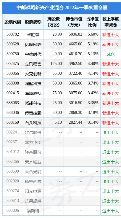 根据2022Q1季报基金重仓股数据,重仓该股的基金共5家,其中持有数量最多的基金为中邮战略新兴产业混合。中邮战略新兴产业混合目前规模为9.0亿元,最新净值4.372(4月25日),较上一交易日下跌5.29%,近一年下跌20.32%。该基金现任基金经理为吴尚。