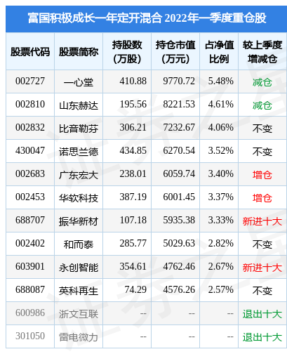 富国积极成长一年定开混合的前十大重仓股如下: