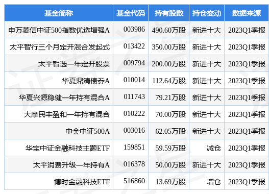 根据2023Q1季报公募基金重仓股数据,重仓该股的公募基金共12家,其中持有数量最多的公募基金为申万菱信中证500指数优选增强A。申万菱信中证500指数优选增强A目前规模为23.81亿元,最新净值1.7712(4月25日),较上一交易日下跌1.68%,近一年上涨9.92%。该公募基金现任基金经理为刘敦。刘敦在任的基金产品包括:申万菱信沪深300指数增强A,管理时间为2019年4月18日至今,期间收益率为22.34%;申万菱信量化对冲策略混合,管理时间为2020年3月25日至今,期间收益率为7.58%;申万菱信双禧混合型发起式A,管理时间为2022年2月22日至今,期间收益率为-2.57%。