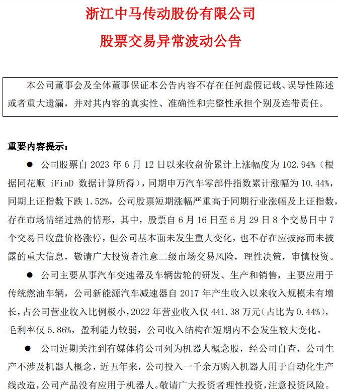 盘后消息,8天7板的中马传动发布股价异动公告,公司生产不涉及机器人概念,近五年来,公司投入一千余万购入机器人用于自动化生产线改造,公司产品没有应用于机器人。公司新能源汽车减速器自 2017 年产生收入以来收入规模未有增长,占公司营业收入比例极小。