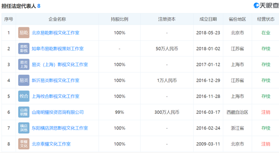 据天眼查显示,黄晓明直接或间接控制的企业多达65家,其中担任法人代表的有8家(其中两家已注销)。
