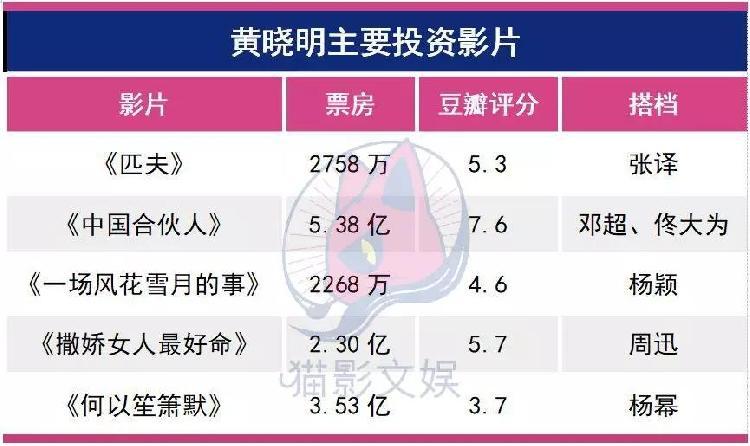 紧接着黄晓明开始成立起个人工作室,在电影上大施拳脚起来。2009年3月份,黄晓明以10万元注册资本成立了北京泰耀文化工作室,先后投资拍摄了《匹夫》《中国合伙人》《一场风花雪月的事》《撒娇女人最好命》《何以笙箫默》等多部影视作品。