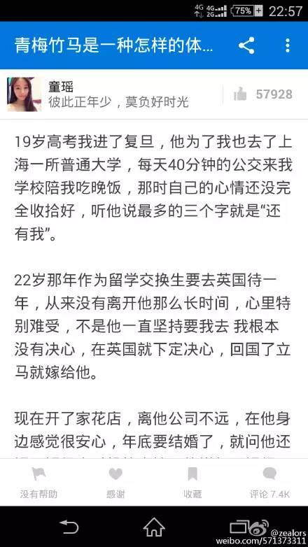 2015年6月,童瑶在这条回答下发布消息称已和男友结婚。5万7千多人的点赞,7386条评论,