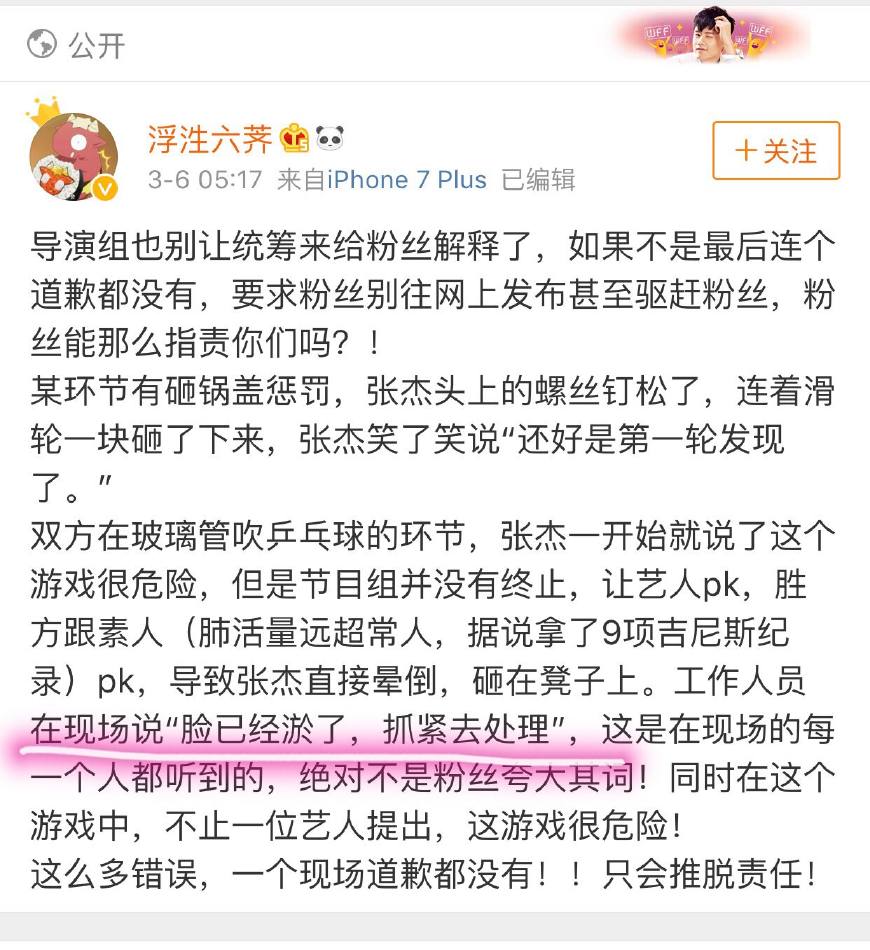 相比之下,张杰的隐忍与暖心简直与节目组的态度形成鲜明对比,他在恢复意识后说的第一句话是“幸亏不是贾玲去玩这个游戏”。