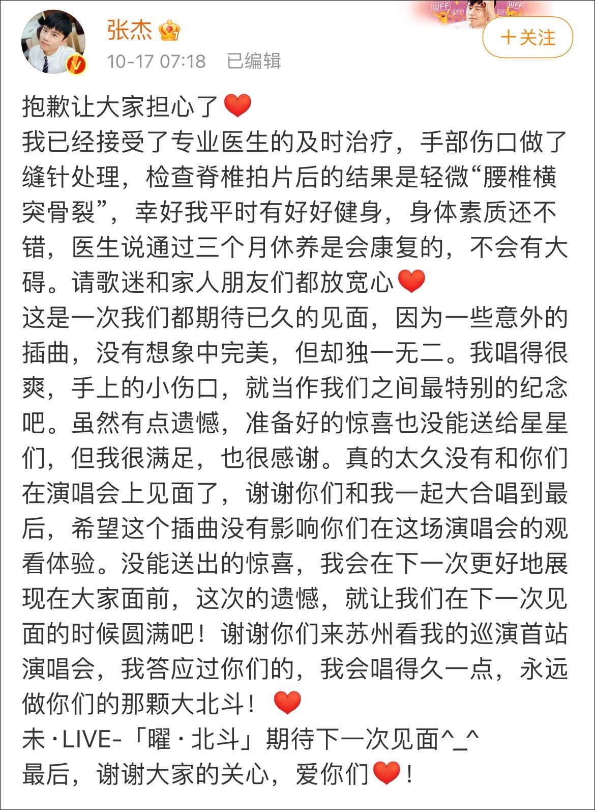 经过后续的检查,他还一度因此被摔成腰椎骨裂,可张杰却在这种情况之下坚持演了3个小时。