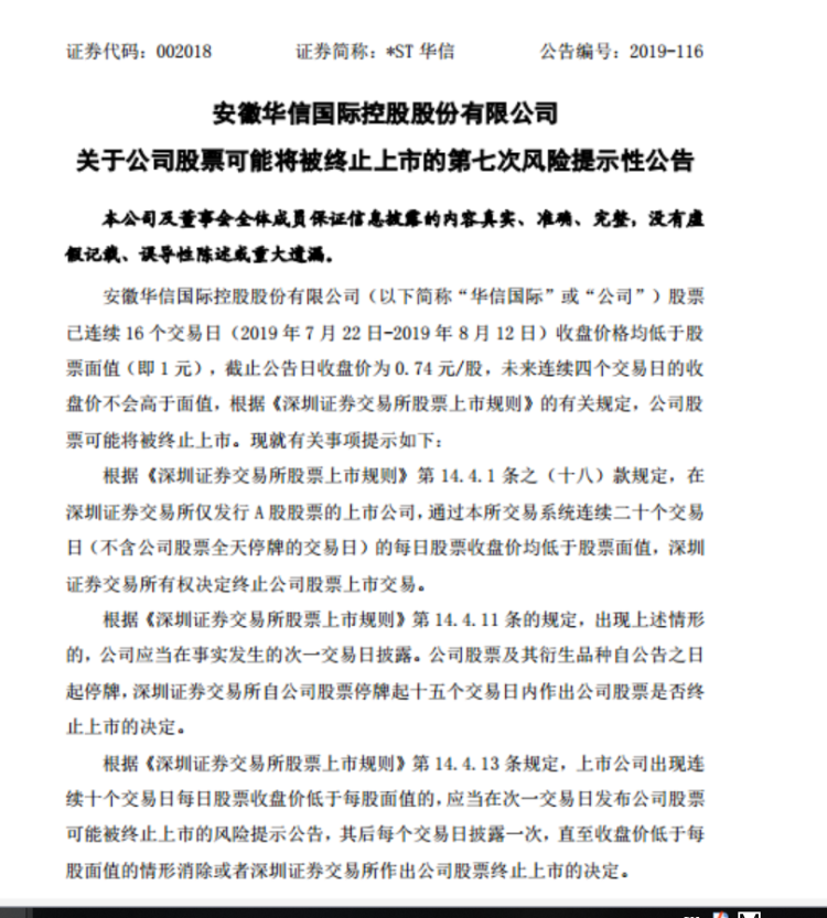 8月12日晚间,*ST华信(002018)发布公司股票可能将被终止上市的第七次风险提示,公司股票已连续16个交易日收盘价格均低于股票面值(即1元),未来连续四个交易日的收盘价不会高于面值,公司股票可能将被终止上市。