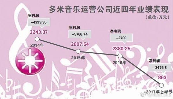 挂牌之后,多米音乐亏损的困境并没有得到缓解。数据显示,公司2016年全年营业收入为2380. 25万元,净亏损2700.47万;2017年上半年,营业收入863. 05万元,净亏损3476. 81万元。