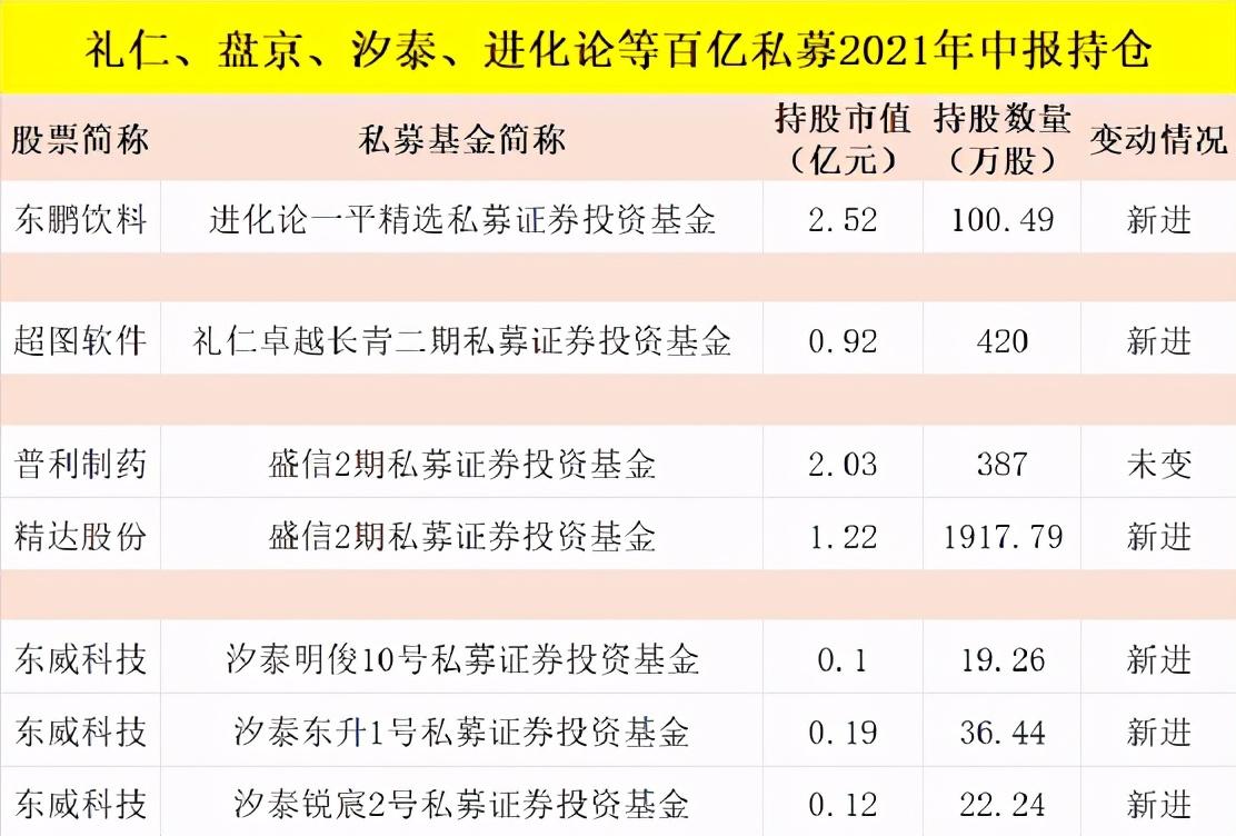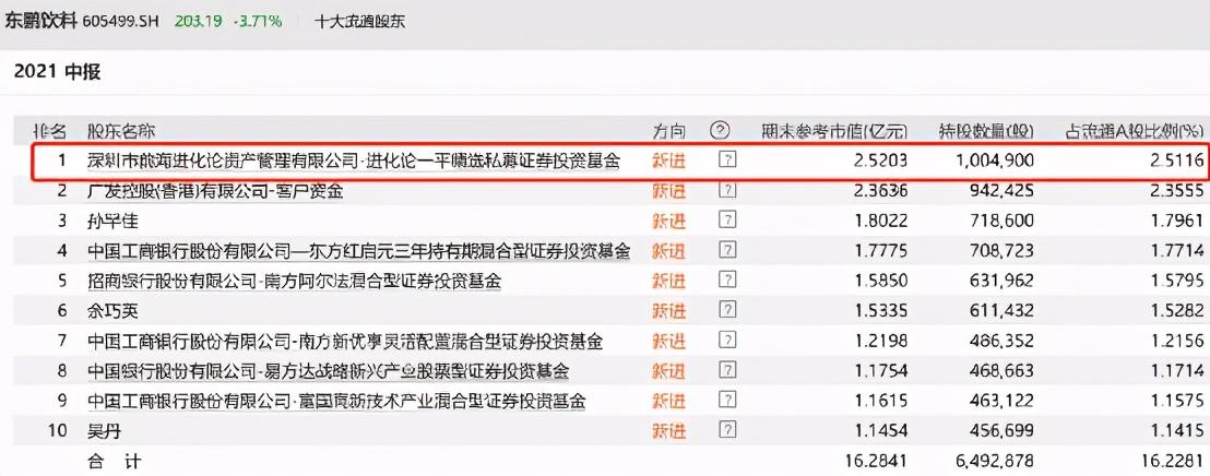 以主动管理与量化对冲管理相结合的双驱动模式为主的新晋百亿私募进化论资产,其掌门人王一平在今年二季度新进了牛股东鹏饮料,进化论一平精选私募证券投资基金持有100.49万股,期末持股市值为2.52亿元,位列第一大流通股东。