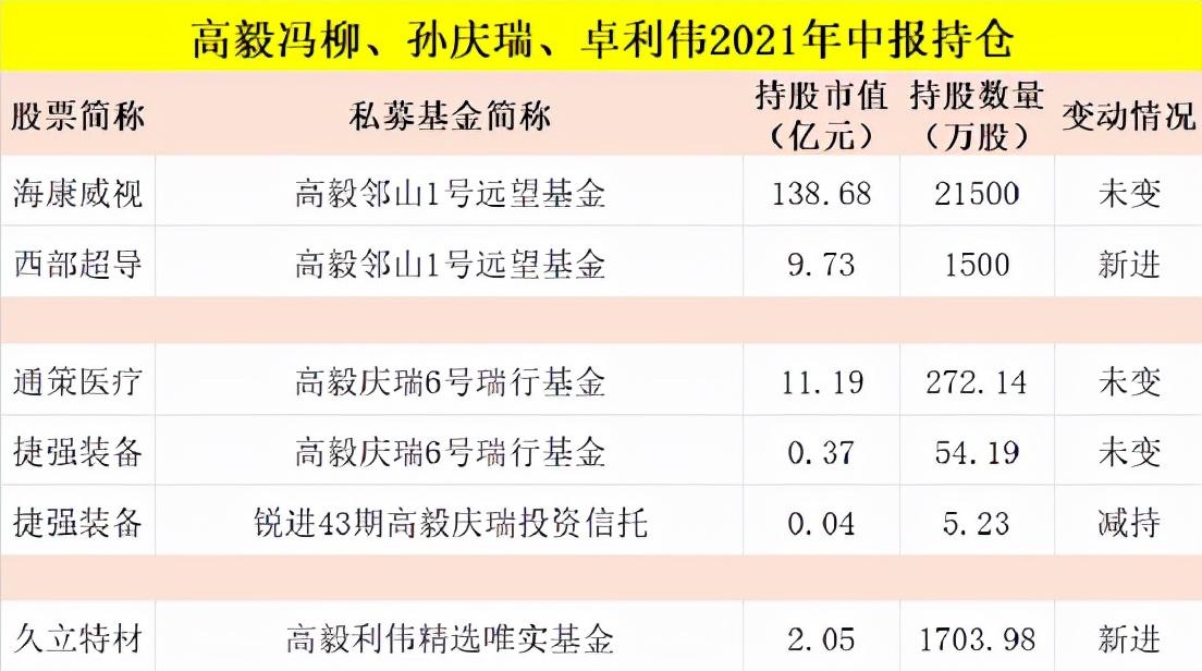 高毅董事总经理孙庆瑞最新持股也曝光了,高毅庆瑞6号瑞行基金持有通策医疗272.14万股,期末持股市值为11.19亿元;锐进43期高毅庆瑞投资信托等两只产品减持了捷强装备,最新持有59.42万股。
