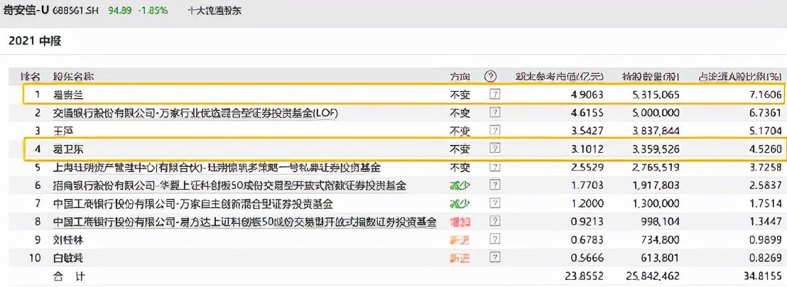 葛卫东对网络安全龙头奇安信保持持股不变,仍然持有335.95万股,期末持股市值为3.10亿元,位列第四大流通股东;同时,葛卫东的姐姐葛贵兰则持有奇安信531.51万股,持股市值为4.91亿元,位列第一大流通股东。