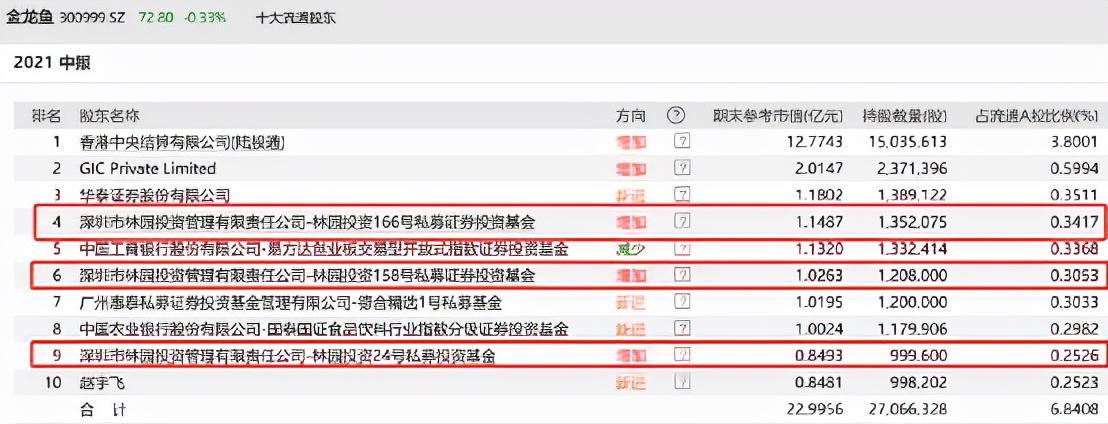 “民间股神”林园在今年二季度增持了“油茅”金龙鱼,旗下林园投资166号、158号、24号三只产品,合计持有金龙鱼355.97万股,期末持股市值为3.03亿元。