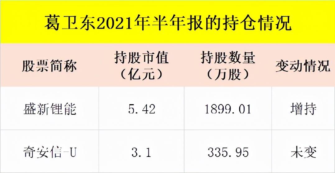 期货大佬、混沌投资董事长葛卫东近年来在A股二级市场频频出手,最新披露的半年报显示,他增持了盛新锂能,持有1899.01万股,二季度末持股市值为5.42亿元。从业绩来看,盛新锂能2021年上半年实现营收11.34 亿元,同比增长50.6%,实现归母净利润2.91 亿元,同比增长273.8%。公司锂盐产品主要应用于新能源汽车动力电池、储能等领域。