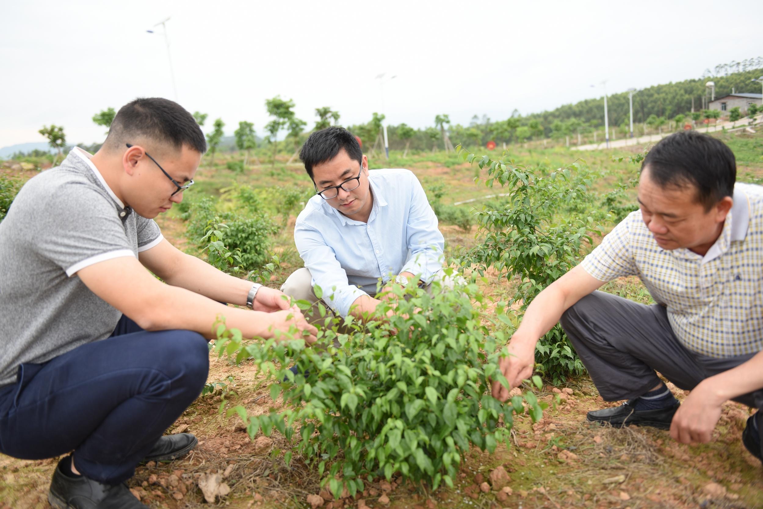 驻村扶贫工作队队员和镇村干部在灯塔镇南药种植基地现场研究加强南药管理方案。2018年底,灯塔镇引进棕榈股份成立南领大健康产业公司,双方合作打造南药基地。 杨坚 摄