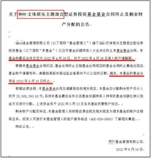 6月10日,一只文体娱乐主题混合基金发布公告称,该只基金的基金合同自2022年6月10日终止,同时,该只基金应分配剩余财产共计3590.94万元,将按本基金最后运作日各基金份额持有人持有的基金份额比例以现金方式进行分配。