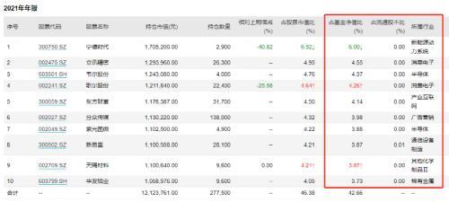 而截至2021年末,在去年新能源板块亮眼表现下,公募基金抱团买入新能源龙头股,该只基金也将宁德时代列为第一大重仓,占基金净值比6%,立讯精密、紫光国微等半导体龙头股也位居前列,被市场视为风格漂移的“跑题基金”。