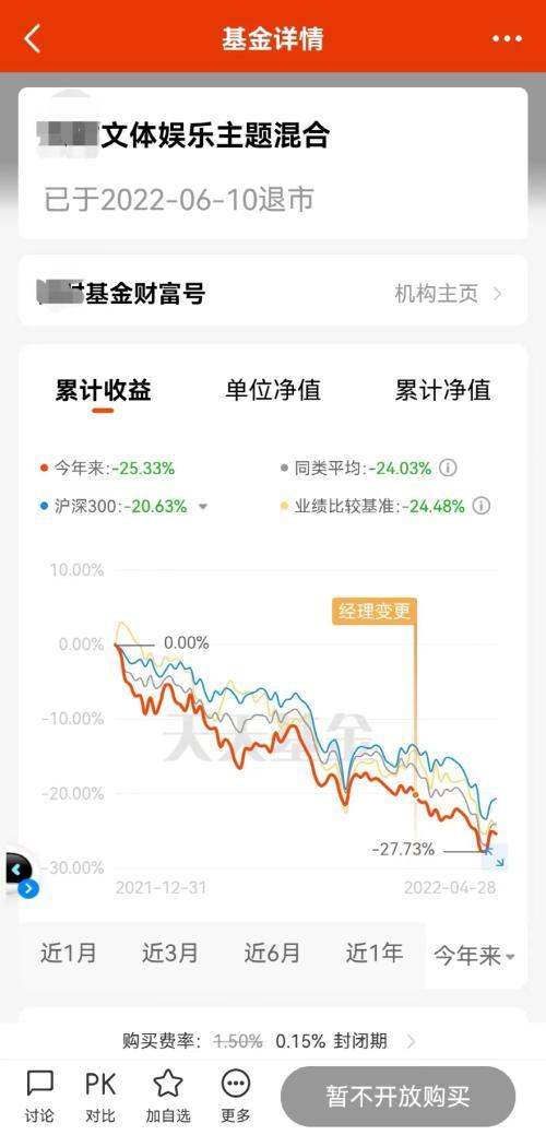 然而,在2022年年初新能源板块调整、宁德时代下挫超20%的背景下,“跑题”重仓新能源的基金也遭遇重挫,截至4月28日停止运作,该只文体娱乐主题基金今年跌幅超25%,超过同期沪深300指数20.63%的跌幅。