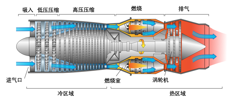 的基础上,在压气机前端加入了风扇部件,将空气分流成两股从内、外两个涵道通过。涡轮风扇发动机比涡轮喷气发动机的油耗更低、推力更大、经济性更高,是