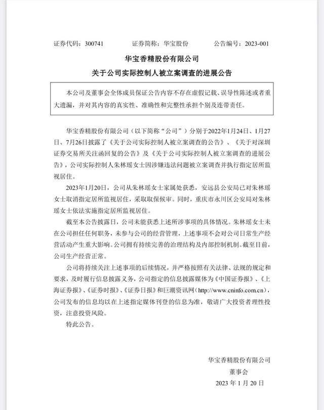 去年7月26日,华宝股份从朱林瑶家属处获悉,长沙县公安局已对朱林瑶解除监视居住,采取取保候审。同日收到间接控股股东华宝国际的通知,其收到信丰县监察委员会立案通知书,信丰县监察委员会决定对朱林瑶进行立案调查。公司同时从华宝国际获悉,安远县公安局对朱林瑶执行指定居所监视居住。
