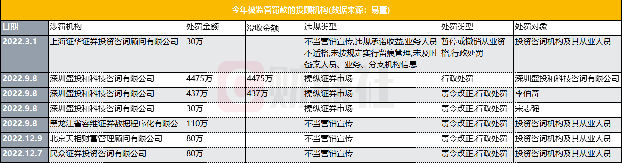 中证协官网显示现有证券投资咨询公司仅有81家。易董平台显示,今年以来,监管部门至少向31家投资咨询公司出具了44份书面监管函,其中有5家投顾公司被处以罚款,也就是说今年有近一半的投顾公司被罚。
