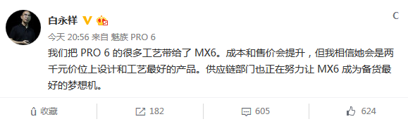 昨日晚间,如今负责魅族手机发布的副总裁白永祥现身微博,称魅族把PRO 6的很多工艺带给了MX6,供应链部门也正在努力让MX6成为备货最好的梦想机。不过白永祥表示,MX6的成本提高了,售价也会提升!但他相信MX6会是两千元价位上设计和工艺最好的产品。