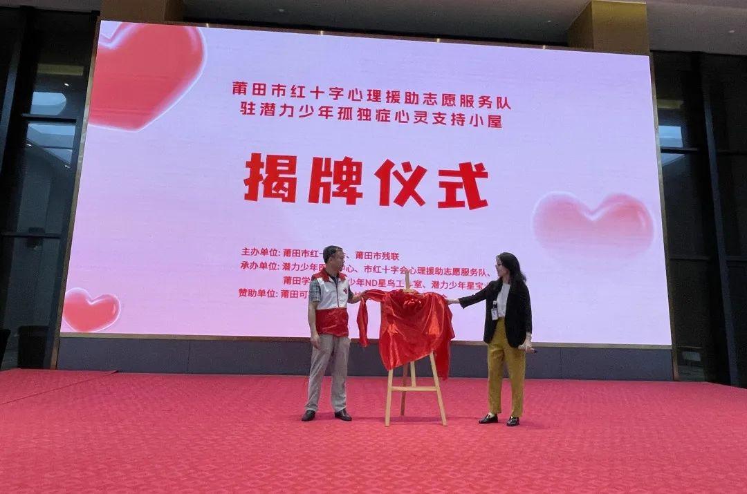 活动现场,市红十字会心理援助服务队队长林开祖与潜力少年康教总监陈诗雅共同为莆田市红十字心理援助志愿服务队驻潜少年孤独症心灵支持小屋进行揭牌