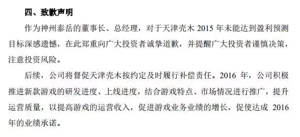 根据神州泰岳与壳木签订的对赌条款所示,壳木软件需在2013-2016各年度净利润达到0.8亿元、1.1亿元、1.5亿元和2.0亿元才能赢得对赌协议。但实际上壳木在2015年度的利润为7582万元,仅做到了对赌要求的一半。剩余的7418万元由李毅及其他壳木软件的股东承担。