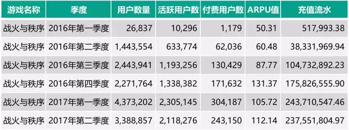 据神州泰岳财报显示,《战火与秩序》在2016年3月推出后迅速走红,其游戏业务各项数据呈爆发式增长,以2016与2017年第二季度同比,用户数量从144.35万上升到338.88万,其中活跃用户数从63.37万上升到211.82万,ARPU值从60.48元上升到112.14元,游戏流水从3833.19万上升到2.37亿元,同时付费用户数从6.20万上升到24.31万。但从表格中可以看到,该产品在2017年上半年总营收超过了4.8亿元,保守估计最高月流水过亿。