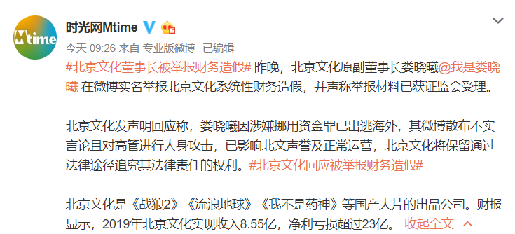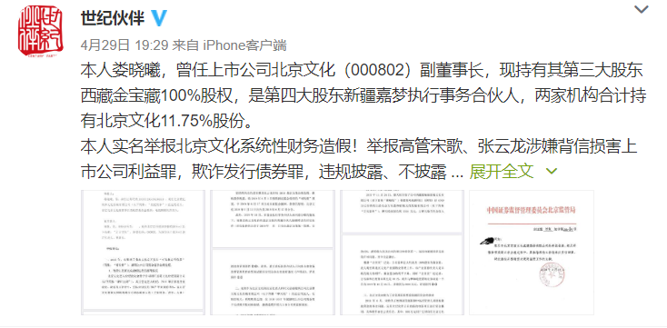 北京文化原副董事长娄晓曦,在微博实名举报北京文化系统性财务造假,并声称举报材料已获证监会受理。