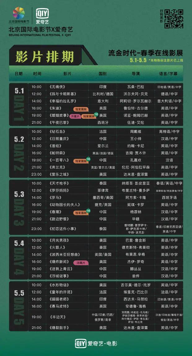 今日,北京国际电影节宣布,其主办的春季在线影展将于5月1日在5月5日举行,展映平台为爱奇艺电影。陈凯歌、佟大为、谭卓将担任特邀策展人。