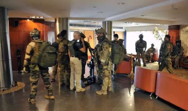 2015年11月20日,在马里首都巴马科,特种部队进入受袭的丽笙酒店内部。